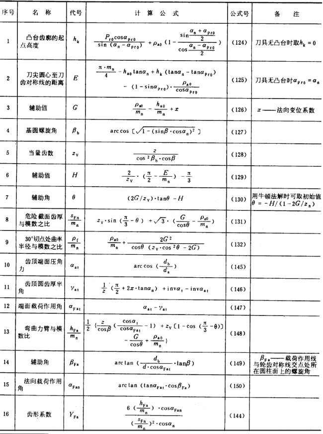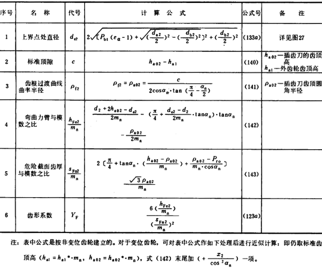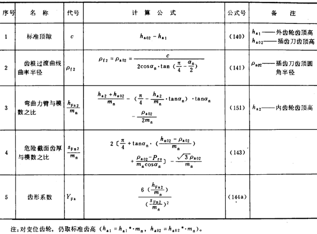 内齒輪的齒形系數YF不僅與齒數和變位系數有關,且與插齒刀的參數有關。爲瞭簡化計算 ,可近似按替代齒條計算(見圖27)。替代齒條的法向齒廓與基本齒條相假,齒高與内齒輪相同,法向載荷作用角αFen等於αn,並以腳标2表示内齒輪 。有關計算公式見表16(适用於Z2>70)。
