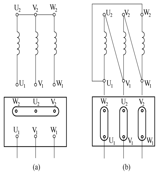 三相繞組由三個彼此獨立的繞組組成,且每個繞組又由若幹線圈連接而成。每個繞組即爲一相,每個繞組在空間相差120°電角度。線圈由絕緣銅導線或絕緣鋁導線繞制。中、小型三相電動機多採用圓漆包線,大、中型三相電動機的定子線圈則用較大截面的絕緣扁銅線或扁鋁線繞制後,再按一定規律嵌入定子鐵心槽内。定子三相繞組的六個出線端都引至接線盒上,首端分别标爲U1, V1, W1 ,末端分别标爲U2, V2, W2 。這六個出線端在接線盒裏的排列如圖所示,可以接成星形或三角形。
