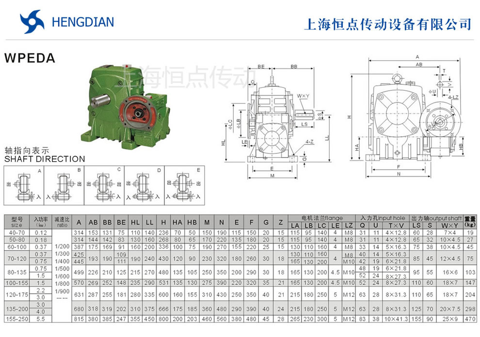 選型指南,WPEDA雙級減速機的外形安裝尺寸.WPEDA雙級減速機法蘭輸入,軸輸出.WPWPEDAEA雙級減速機軸指向表示方法.機座号40-70到155-250,速比200到900.