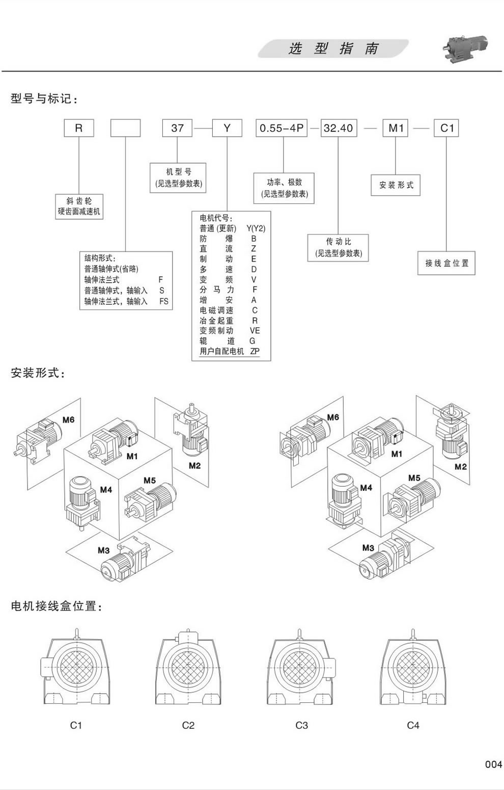 R系列減速機型号表示方法:R37-Y0.55-4P-32.40-M1-C1, 安裝形式M1,M2,M3,M4,M5,M6,接線盒位置C1,C2,C3,C4